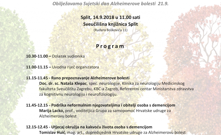 Povodom obilježavanja Svjetskog dana Alzheimerove bolesti, Udruga za palijativnu skrb i mentalno zdravlje u Splitu „Vita PLUS“ organizira predavanje o Alzheimerovoj bolesti koje će uključivati nekoliko bitnih tema. Kako ova bolest zahvaća sve veći broj ljudi, želja nam je educirati građane o ranom prepoznavanju Alzheimerove bolesti te pružiti informacije i potporu njegovateljima i obiteljima koje se susreću s ovom bolesti.