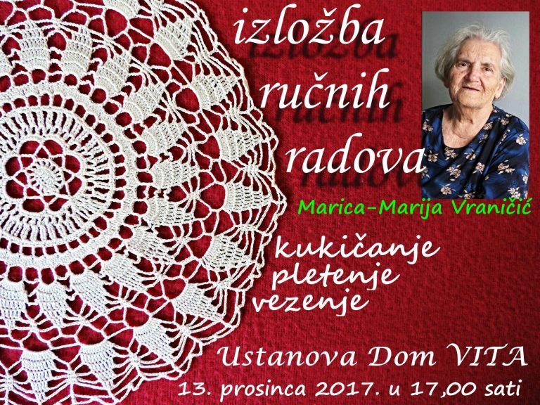 Dođite na izložbu ručnih radova Marice-Marije Vrančić koja će nam pokazati umijeće kukičanja, pletenja i vezenja! Rezervirajte datum 13. prosinca 2017. u 17h i posjetite nas!